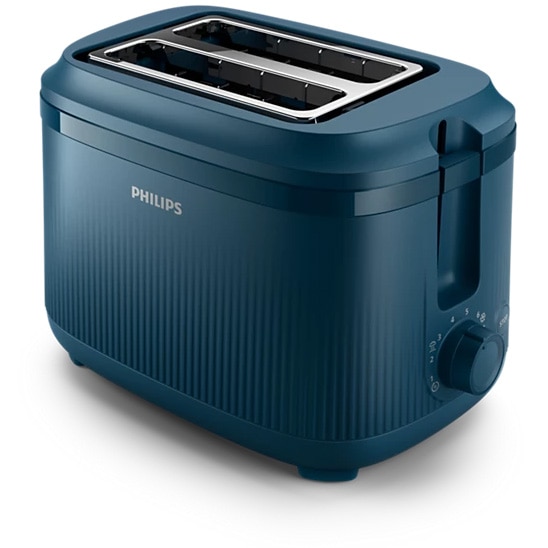 Prajitor de paine Philips HD2511/70 seria 3000, 900 W, 8 setari de rumenire, 2 fante mari cu auto-centrare, maneta de ridicare, gratar pentru incalzirea chiflelor, oprire automata, tava de firimituri detasabila, buton de oprire instantanee, albastru E E |