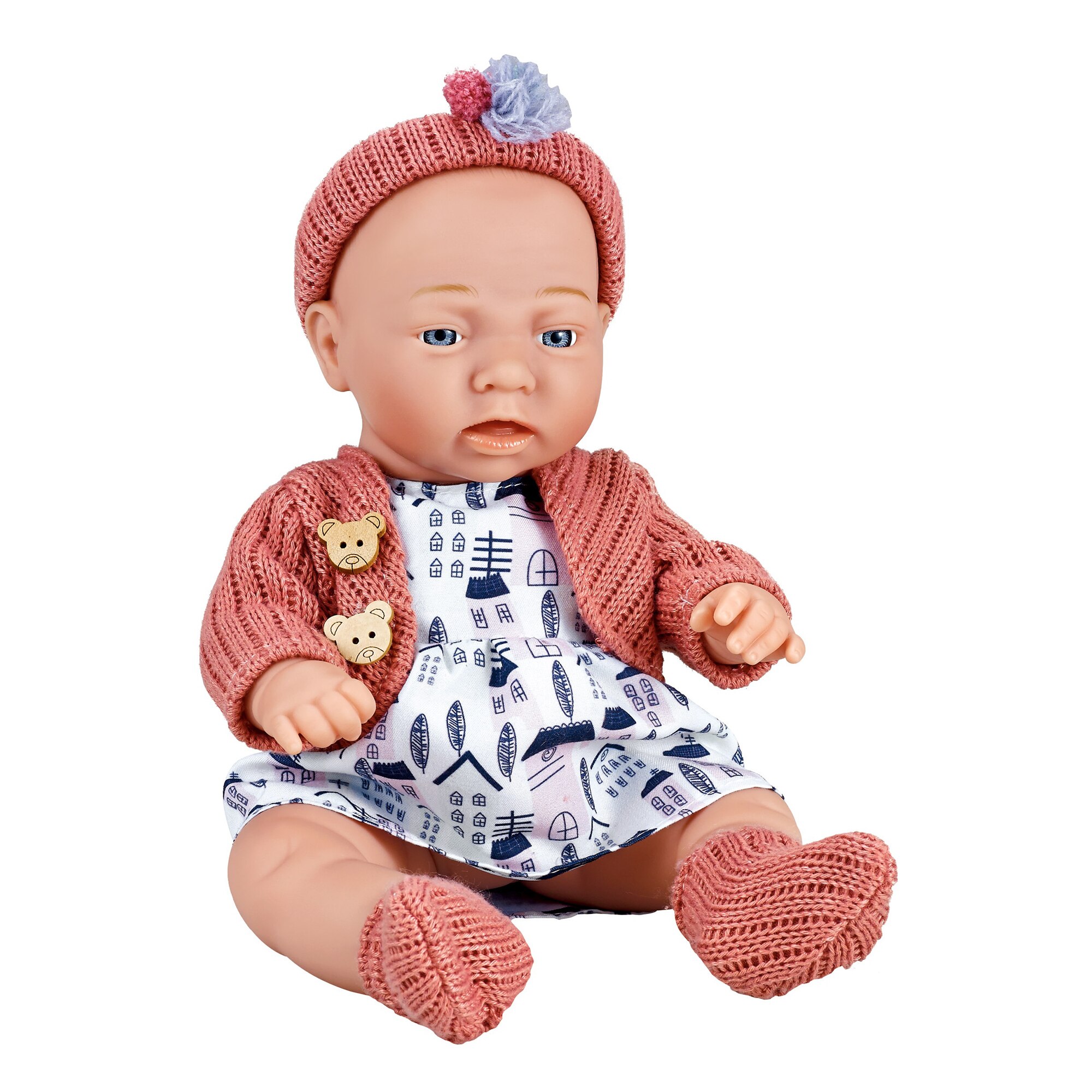 Papusa bebelus Mappy, 30 cm, cu jacheta, suzeta si jucarie zornaitoare, alb / roz E E |