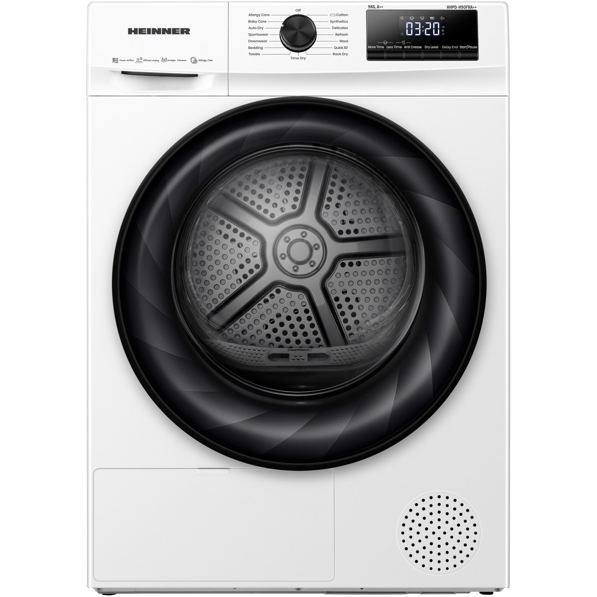 Uscator de rufe Heinner HHPD-H90FRA++, Pompa de caldura, 9 kg, 15 programe, Clasa A++, Display LED, Power AirFlow, Alb E E |