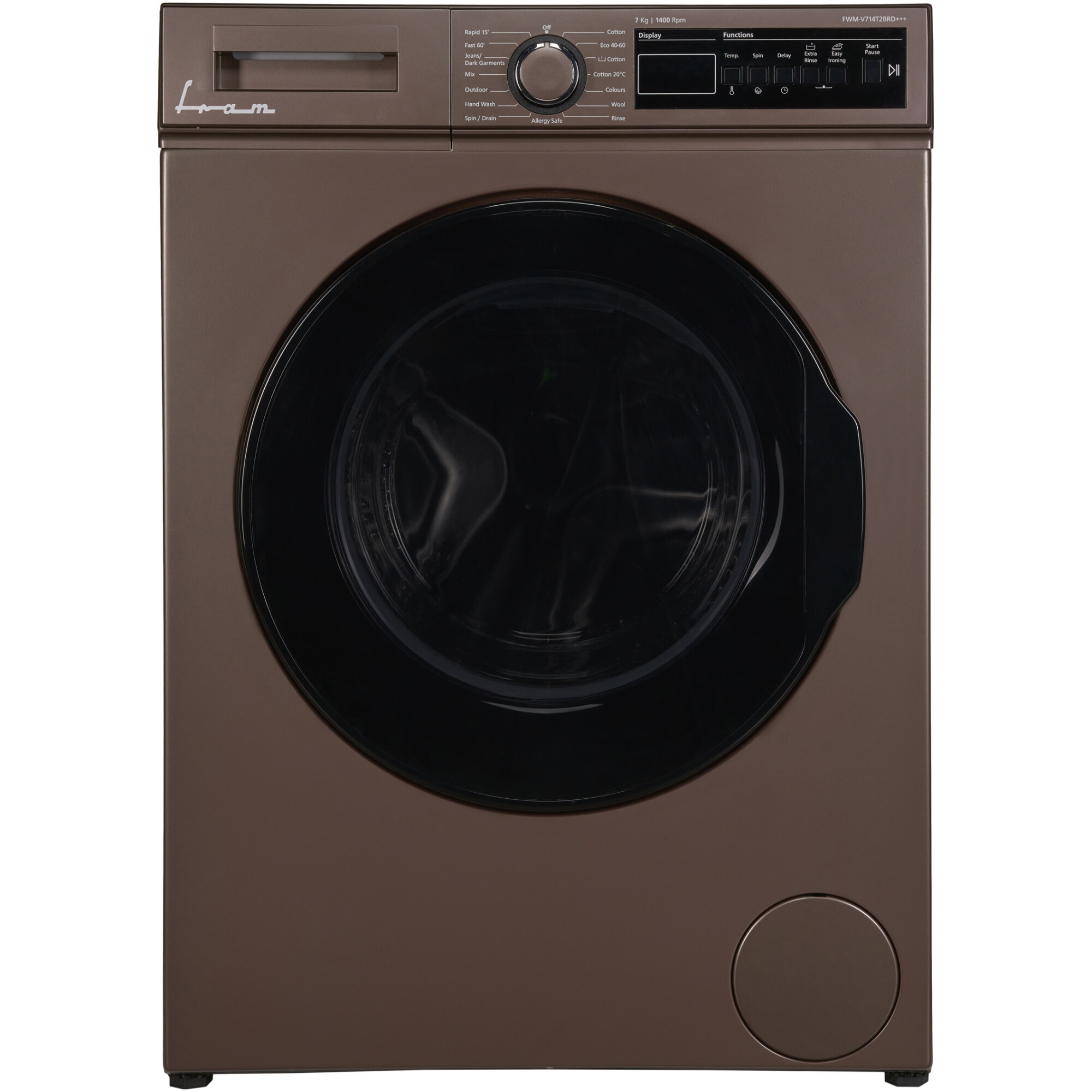 Masina de spalat rufe Fram FWM-V714T2BRD+++, 7 kg, 1400 rpm, Clasa D, Display digital, Allergy safe, Start intarziat, Anti-sifonare, Eco-Logic, Cafeniu pastelat E E |