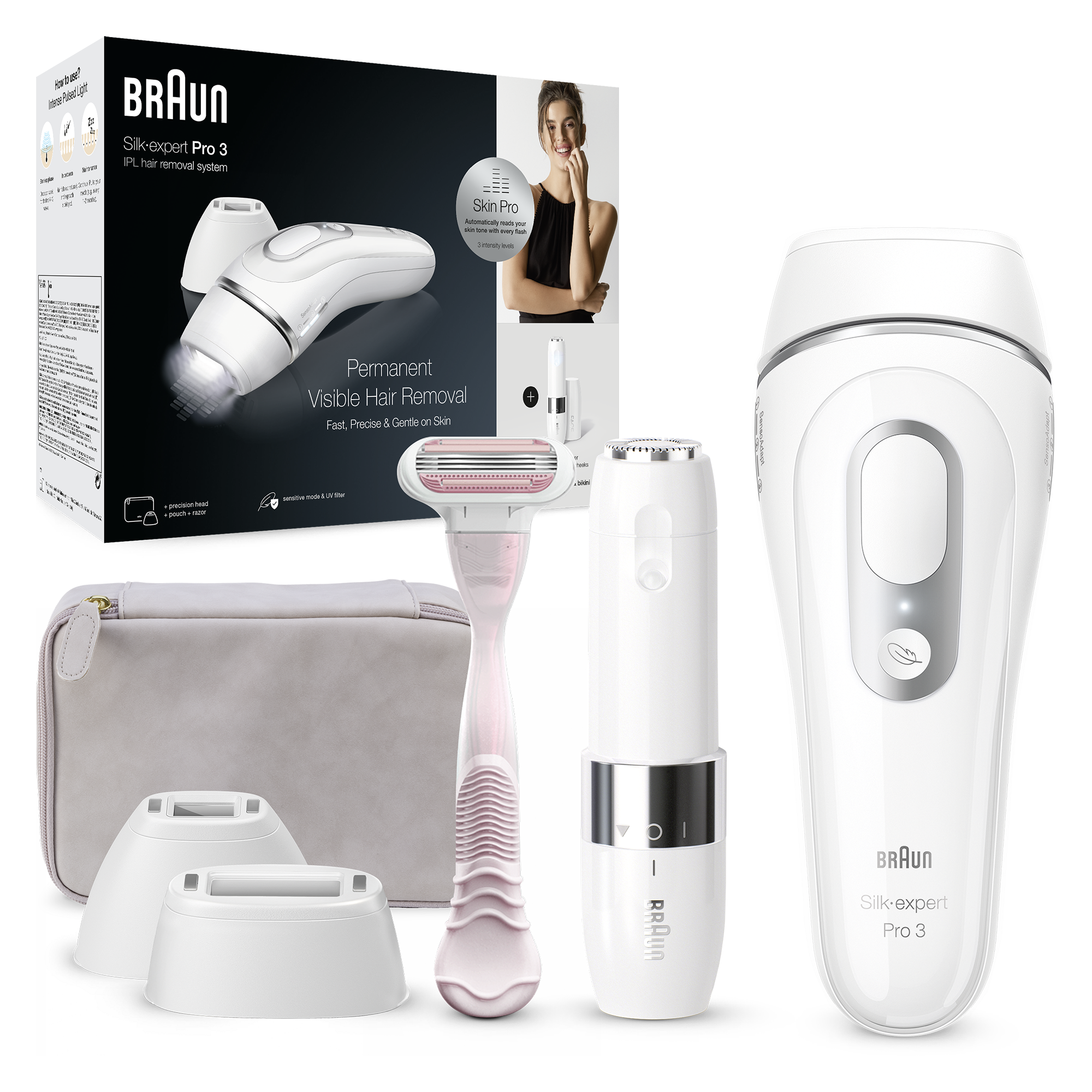 Epilator IPL Braun Silk-expert PRO 3 PL3139 Senzor automat & continuu Skin pro, 300.000 impulsuri, 3 niveluri de intensitate, 100 de impulsuri pe minut, cap de precizie, Trusa de voiaj, Aparat de ras Venus, Mini epilator facial, Alb E E |