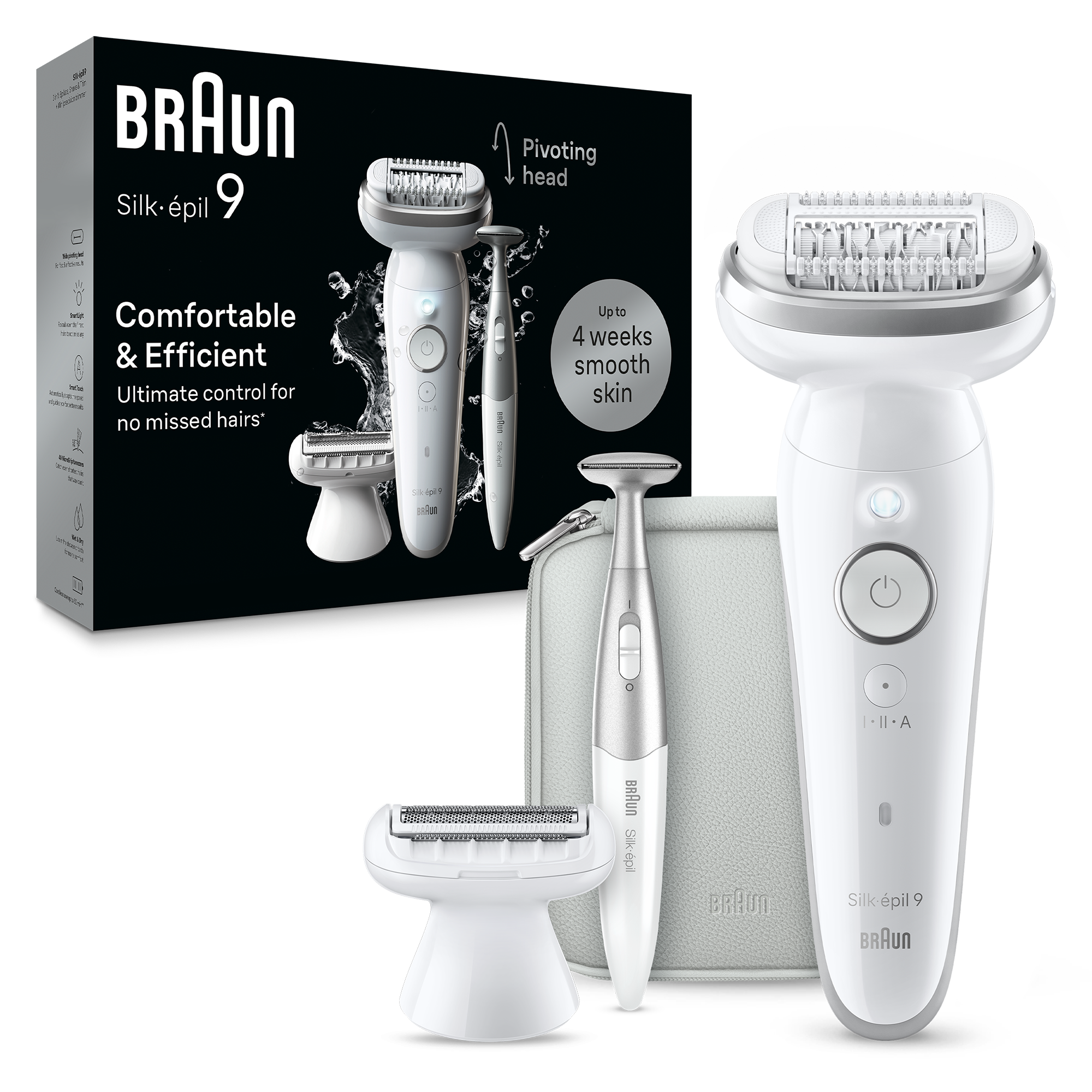 Epilator Braun Silk-épil 9 9-241 Wet & Dry, MicroGrip, Smart Light, 2 viteze, 40 pensete, Trimmer bikini + accesorii, Cap de ras + Pieptene, 1 capac pentru contactul cu pielea, Geanta de voiaj, Alb/Gri Pana la 1 luna de piele catifelataEpilatorul Braun Silk-épil 9241 asigura pana la 1 luna de piel | 882.04 | 1473 | 1 | |