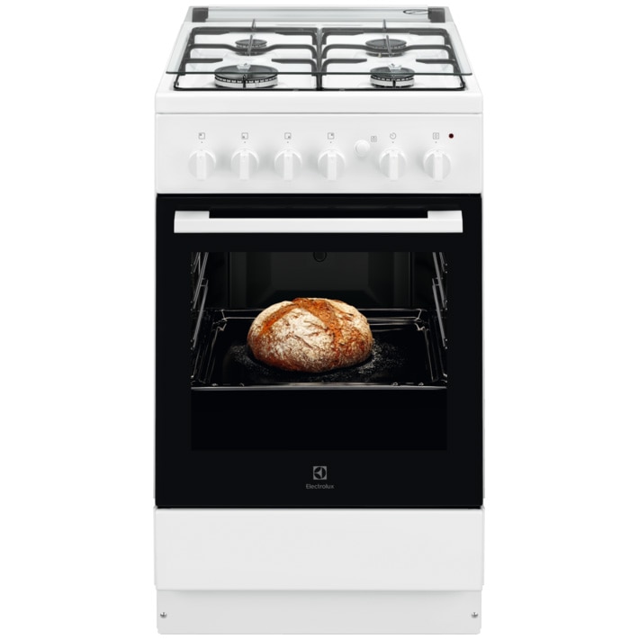 Aragaz Electrolux LKG504002W, Gaz, 4 arzatoare, Aprindere integrata plita + cuptor, Siguranta plita + cuptor, Autocuratare catalitica, 50 cm, Alb E E |