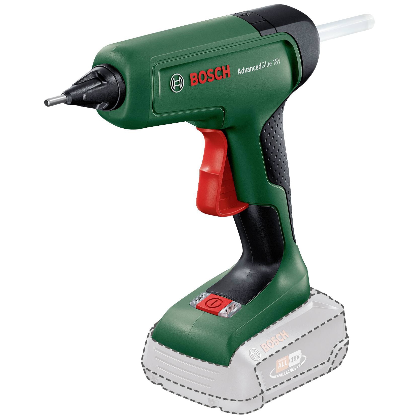 Pistol de lipit pe acumulator Bosch AdvancedGlue 0603264800, 18 V, 20 g/min capacitate lipire, 11 mm diametru bagheta, 200 °C temperatura, fara acumulator/incarcator E E |