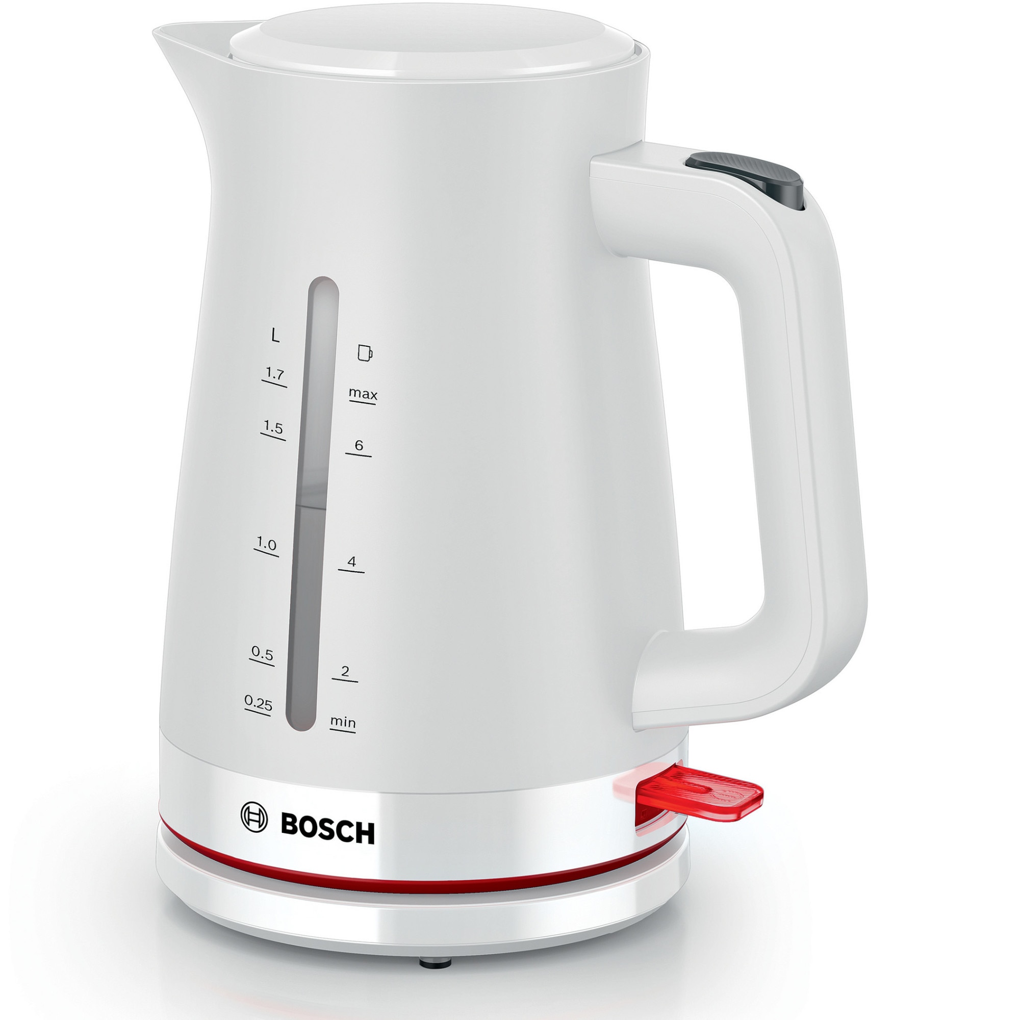 Fierbator de apa Bosch TWK3M121, 1.7l, filtru de calcar,oprire automata, protecţie împotriva supraincalzirii şi funcționarii fara apa, oprire în momentul ridicarii canii de pe suport, Alb E E |