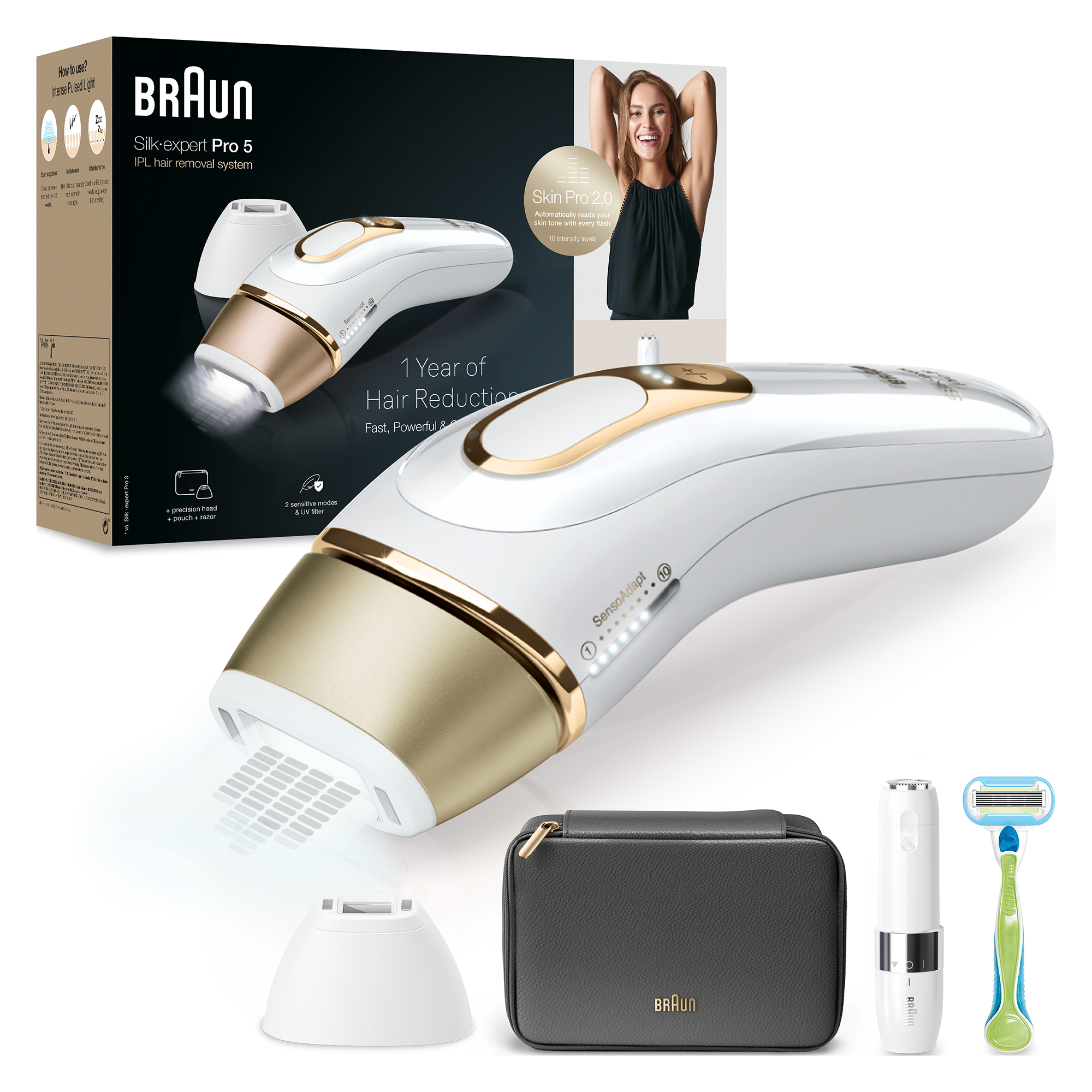 Epilator IPL Braun Silk-expert PRO 5 PL5146 Senzor automat & continuu Skin pro 2.0, 400.000 impulsuri, 10 niveluri de intensitate, 125 de impulsuri pe minut, Cap de precizie, Trusa de voiaj, Aparat de ras Venus, Alb E E |