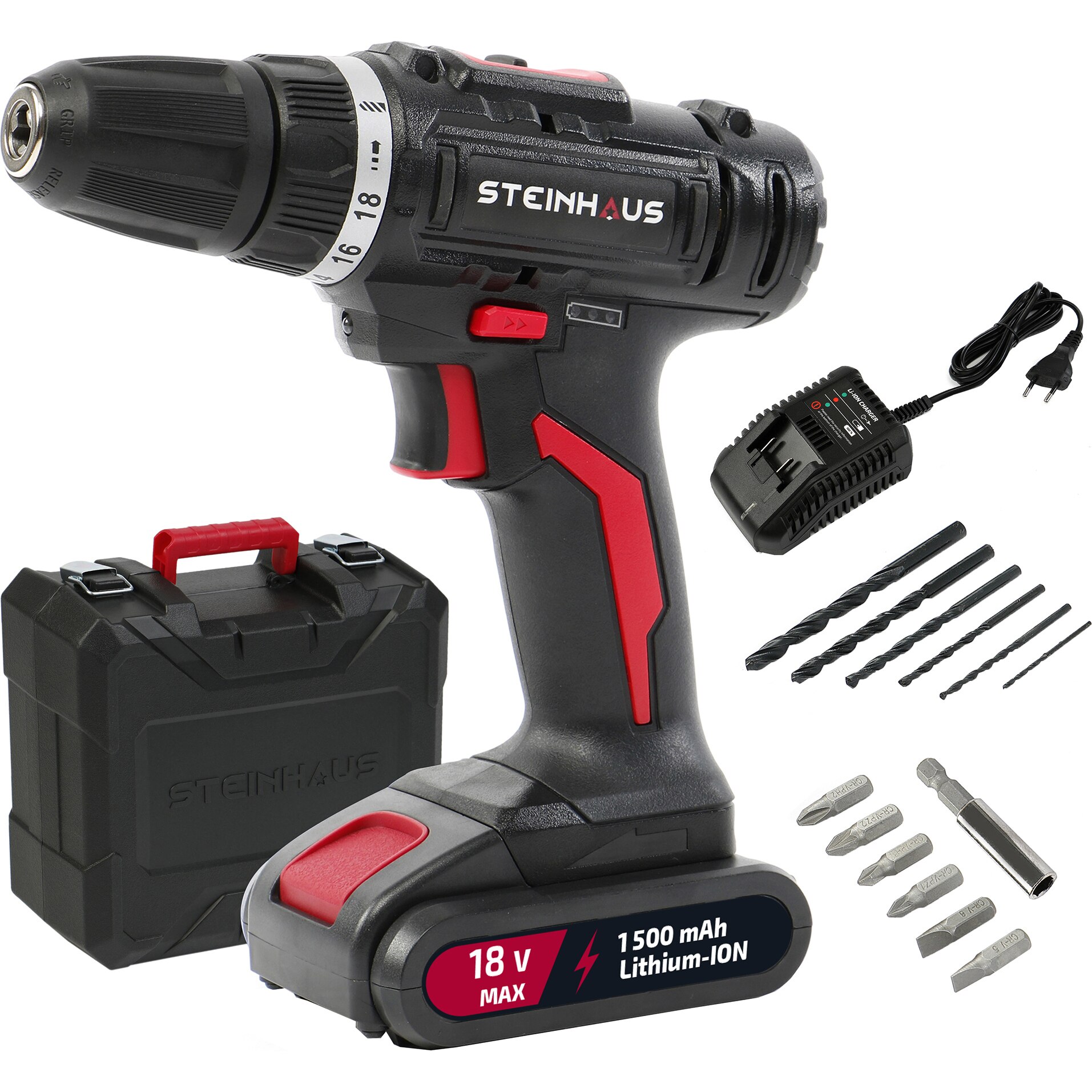 Masina de gaurit si insurubat (bormasina) cu acumulator 18V 15Ah LiIon Steinhaus, PROCD18, 26Nm, 2 trepte 3501350 RPM, mandrina rapida 10mm, 13 accesorii, cutie plastic E E |