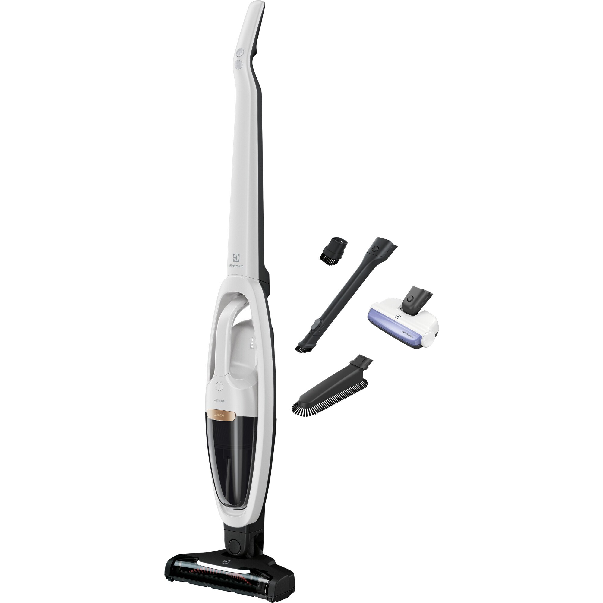 Aspirator vertical 2in1 Electrolux Well Q8 WQ81-ALRS, 25,2V HD, 2 trepte de putere, Perie parchet cu LED, Perie cu UV pentru tapiterie, Perie pentru mobila, Alb metalic Performanta excelenta. Mereu la indemana.Cu o unitate portabila accesibila cu usurinta si accesorii incorporate, aspiratorul fara f | 1573.05 | 2627 | 0 | |