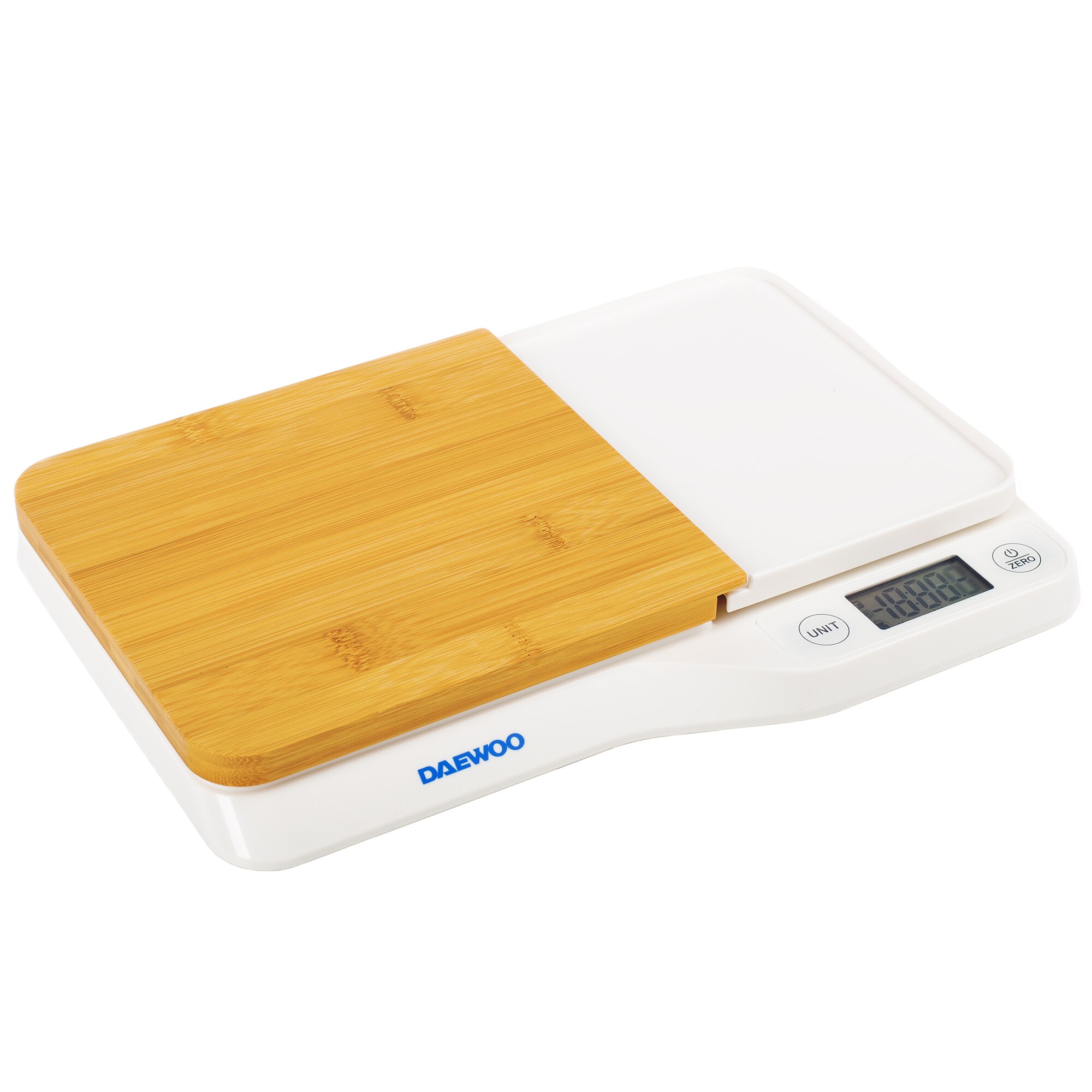 Cantar de bucatarie cu tocator Daewoo DKS10W, 5 kg, 1 g, tocator din bambus, LCD, Alb E E |