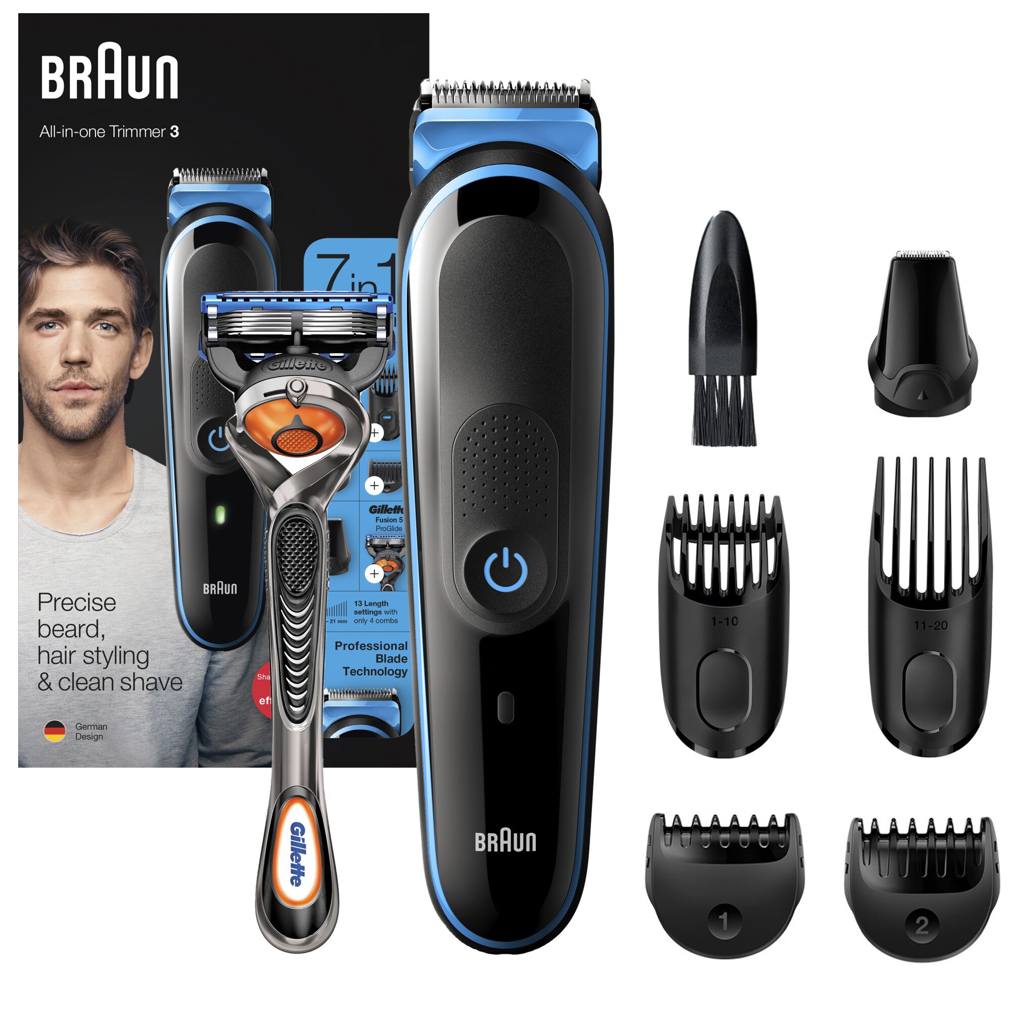 Aparat de tuns multifunctional Braun MGK3245 Wet&Dry, 7in1 pentru fata si corp, 4 piepteni, 1 accesoriu extra, Aparat de ras Gillette, NegruAlbastru E E |