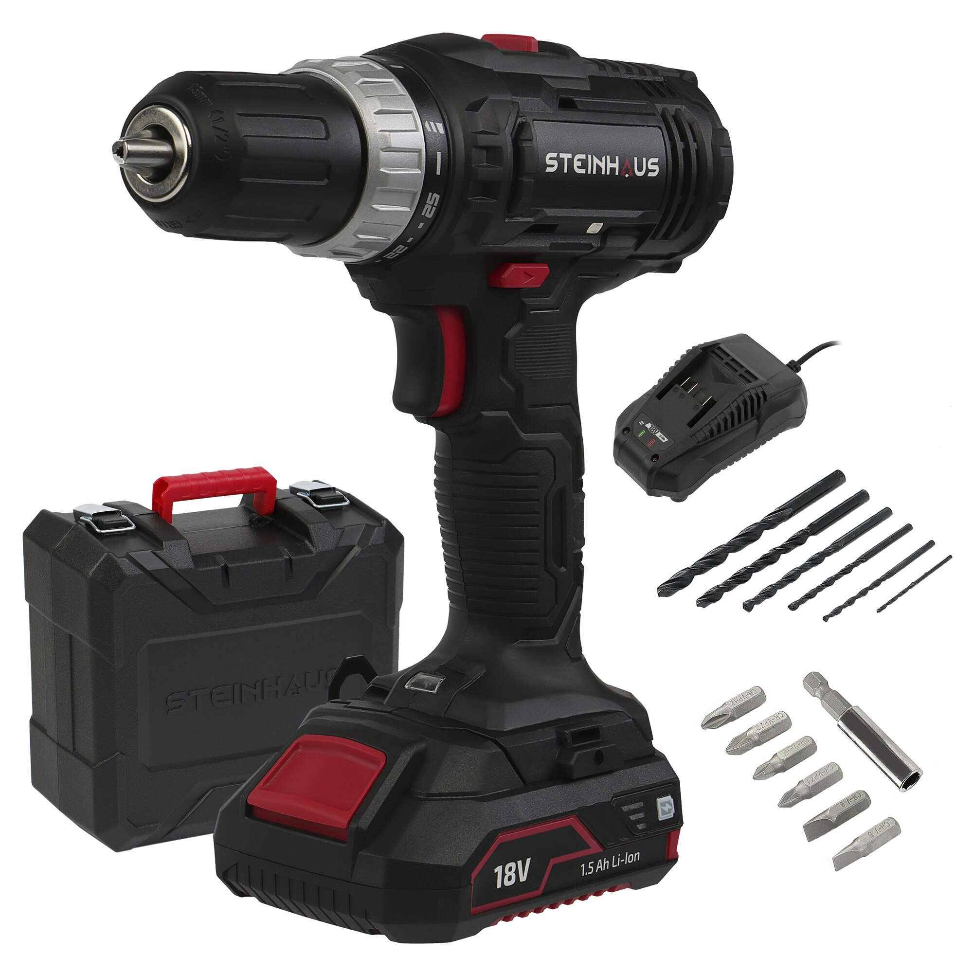 Masina de gaurit si insurubat (bormasina) cu acumulator 18V 1.5Ah Li-Ion Steinhaus, PRO-CD18+, 30Nm, 2 trepte 400/1400 RPM, mandrina rapida 13mm, 13 accesorii, cutie plastic E E |