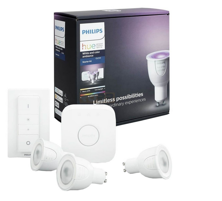 Pachet 3 becuri inteligente LED Philips Hue Lumina alba si colorata, GU10, 6.5W, 250 lm + Bridge, Intrerupator cu variator inclus PHONETASTIC GSM PHONETASTIC GSM |