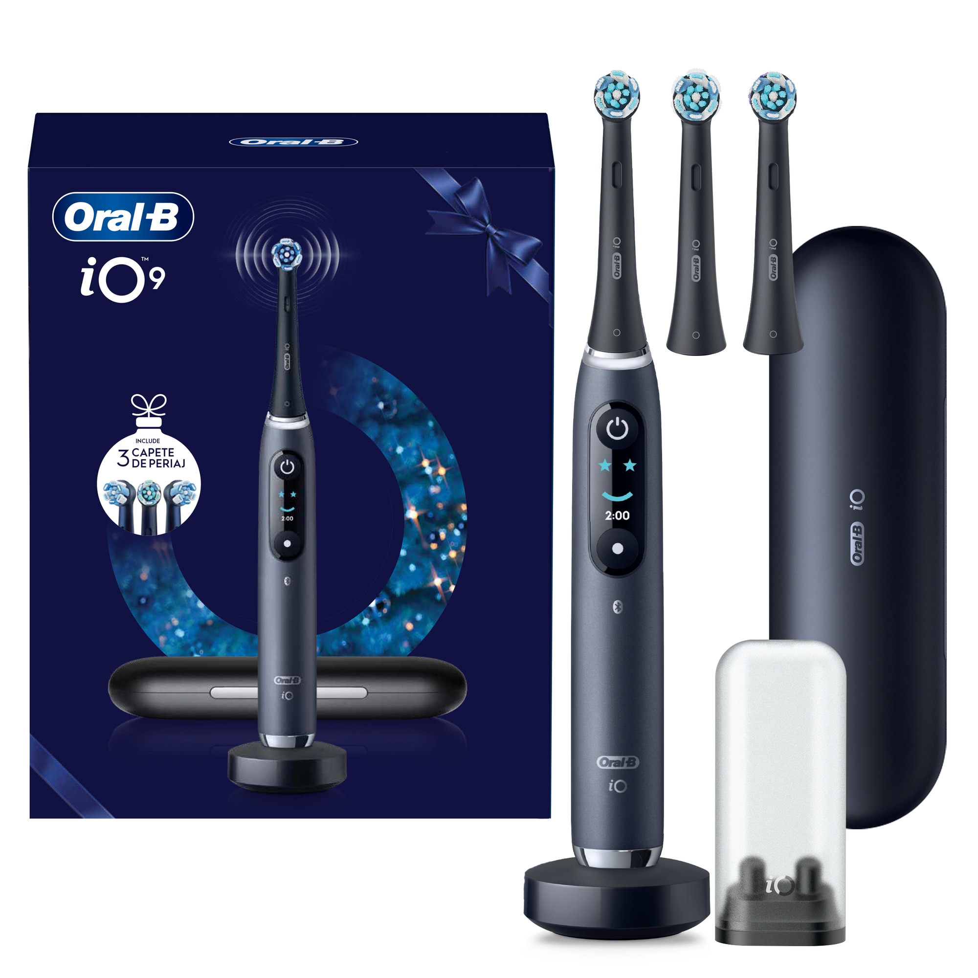 Set cadou periuta de dinti electrica Oral-B iO9 + 2 capete de periaj cu Tehnologie Magnetica si Micro-Vibratii, Inteligenta artificiala, Display led, Senzor de presiune Smart, Timer vizibil, Trusa de calatorie, Negru E E |