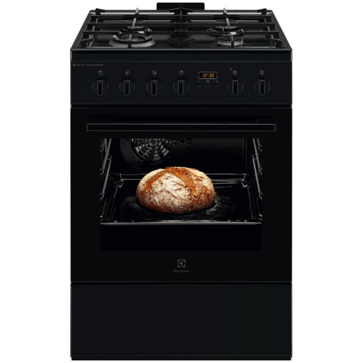 Aragaz Electrolux LKK664220K, Mixt, 4 arzatoare, SteamBake-gatire cu abur; AirFry, Autocuratare Catalitica, Timer mecanic, Aprindere integrata plita si cuptor, Grill Electric, Rotisor, Iluminare cuptor, 60 cm, Negru E E |