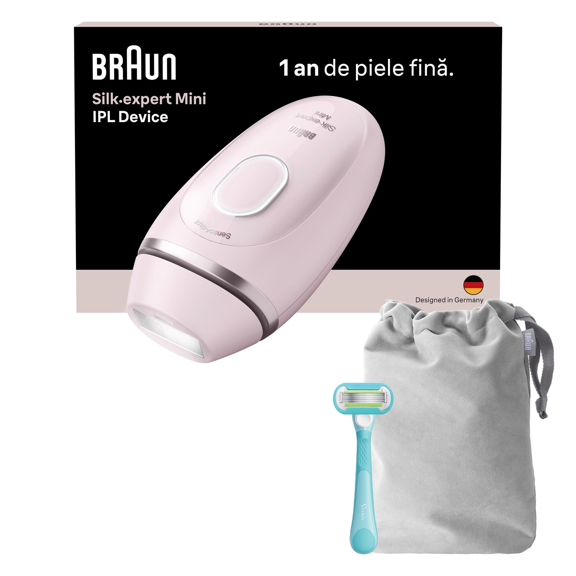 Epilator IPL Braun IPL Silk·expert Mini PL1111, SensoAdapt, 300.000 impulsuri, 3 niveluri de intensitate, Corp si fata, Aparat de ras Venus, Saculet de calatorie, Roz E E |