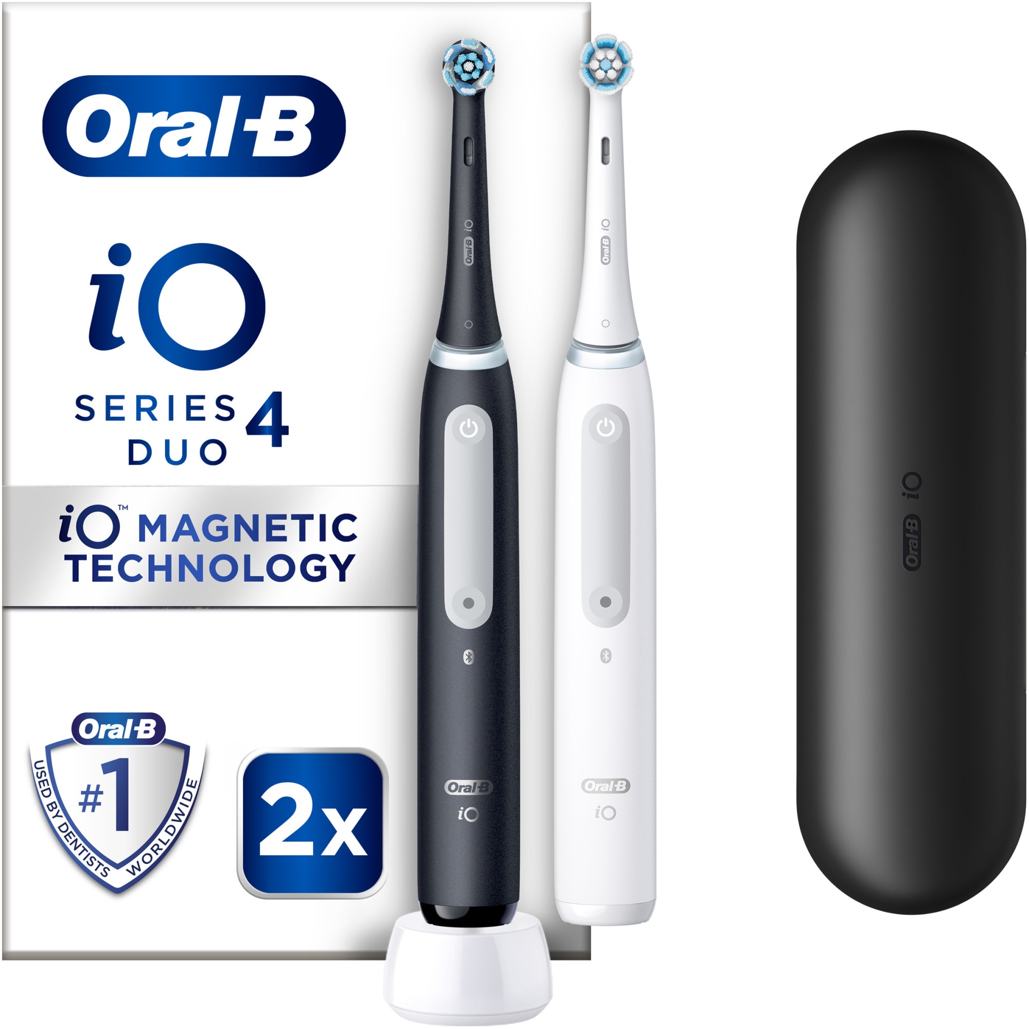 Set 2 x Periuta de dinti electrica Oral-B iO4 cu Tehnologie Magnetica si Micro-Vibratii, Senzor de presiune Smart, 4 moduri, 2 capete, Trusa de calatorie, Alb/Negru E E |