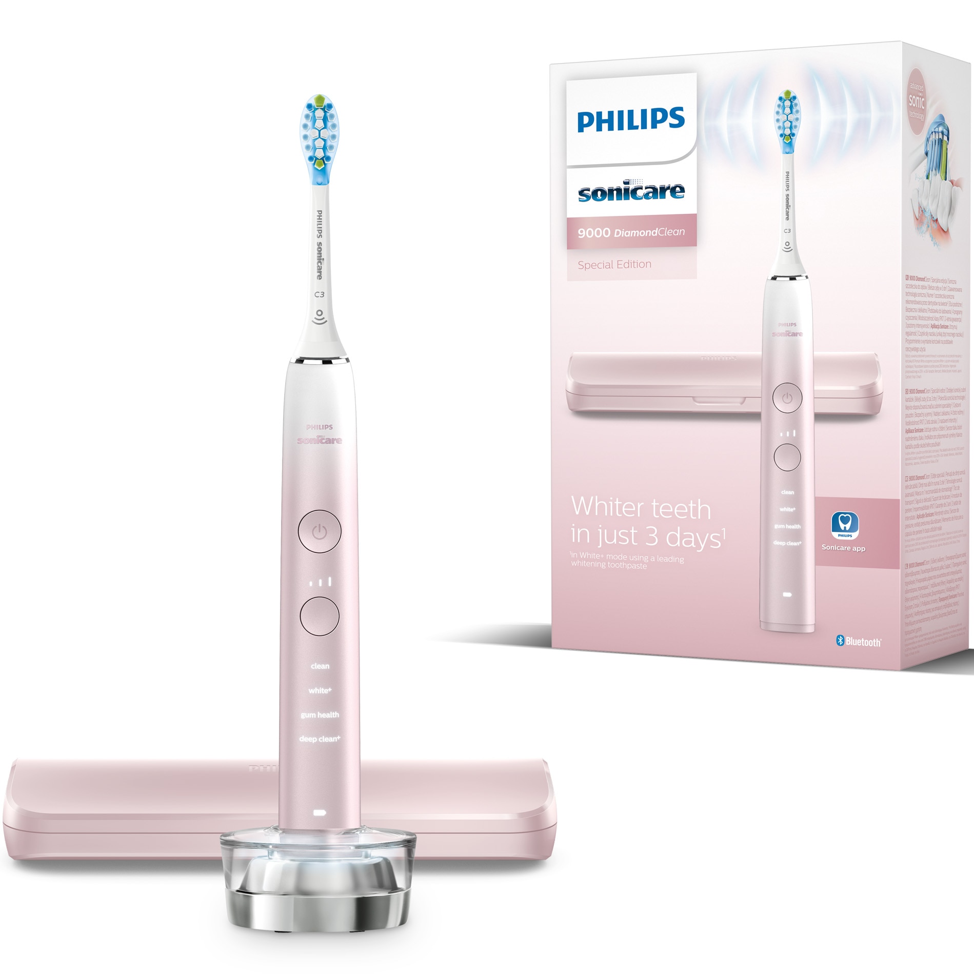 Periuta de dinti electrica Philips Sonicare DiamondClean 9000 HX9911/84, 62000 miscari/min, 4 moduri de curatare, 3 nivele intensitate, senzor presiune, functia BrushSync, aplicatie Sonicare, wireless Bluetooth, toc transport, baza de incarcare, Roz E E |