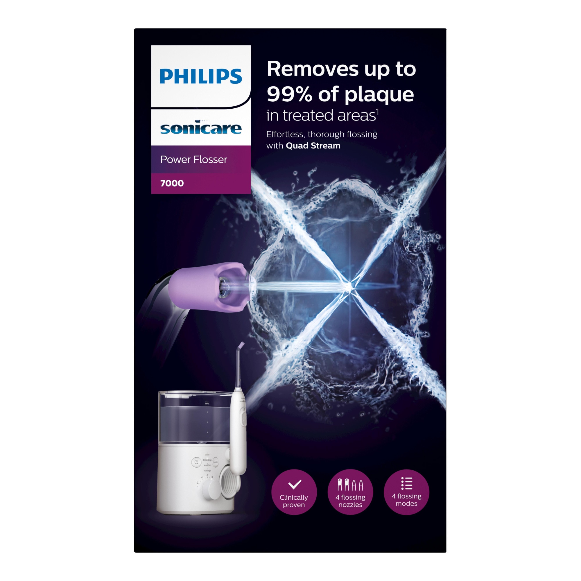 Irigator bucal Philips Sonicare Power Flosser 7000 HX3911/40, tehnologie Quad Stream, 600 ml, 4 moduri de curatare, 10 niveluri de intensitate, 4 capete de curatare, toc de depozitare pentru capete, Alb E E |