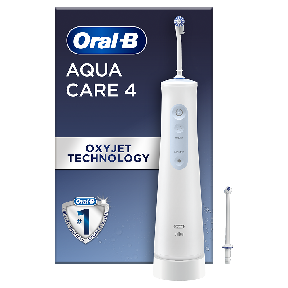 Irigator bucal portabil Oral-B AquaCare 4, Tehnologie Oxyjet, 2 intensitati, 3 fluxuri de apa, 2 capete, fara fir, Alb E E |