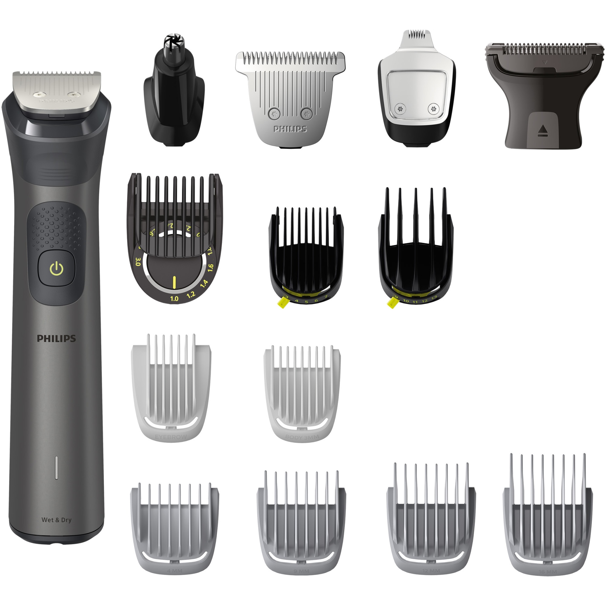 Aparat de tuns barba si parul 15 in 1 Philips Multigroom All in One MG7940/15, tehnologie BeardSense, lame din otel cu auto-ascutire, 22 setari de lungime, rezistent la apa, husa, Negru / Argintiu E E |